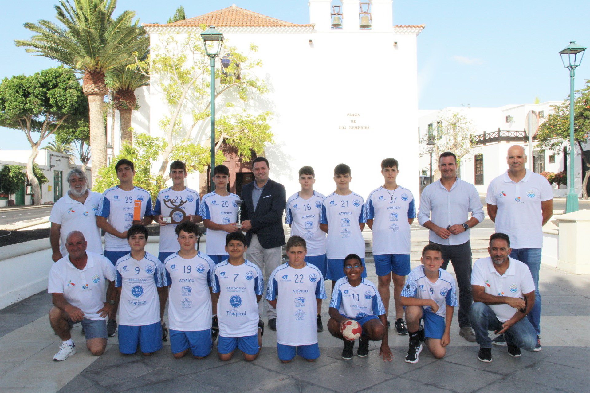 Los jugadores del equipo infantil masculino del Club Balonmano Ajaches de Playa Blanca visitaron este jueves la Plaza de Yaiza y la iglesia de Los Remedios para ofrecer a su municipio, representado por el alcalde, Óscar Noda, y el concejal de Deportes, Ángel Lago, la cosecha de la temporada 2021 - 2022 que acaban de finalizar con resultados sobresalientes: doblete en Lanzarote, alzando los títulos de Liga y Copa Insular, y un más que dignísimo tercer puesto compitiendo en el Campeonato de Canarias celebrado este mes en Tenerife.