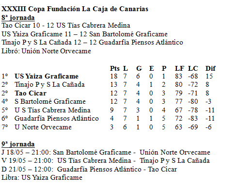 • Los resultados que ofreció la octava jornada de la Copa Fundación La Caja de Canarias, reavivan la lucha por la segunda plaza que da derecho a disputar la final. En la noche del jueves el US Tías Cabrera Medina se imponía por 10 a 12 en su visita al Tao Cicar. Apurando los sureños una de sus oportunidades para no quedar totalmente descolgados.