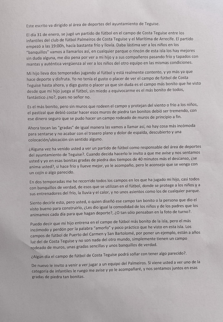 En el mismo realiza una comparación con otros campos de la isla que han priorizado la parcela deportiva y la comodidad, antes que a la estética.