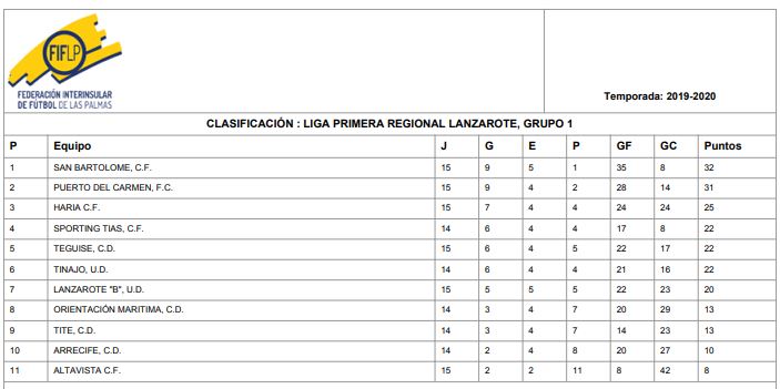 Buscando un paralelismo con las actuaciones propuestas por RFEF en su escrito del pasado martes para otras categorías la situación actual, si se da por finalizada la liga regular, nos dice que en la Primera Regional el San Bartolomé CF es el primer clasificado con 32, segundo es el Puerto del Carmen con 31, tercero el Haría CF con 25 y la cuarta plaza la ocupa el Sporting Tías con 22 y un partido menos. Esos serían los equipos que en principio disputarían el play off de ascenso, aunque hay equipos empatados a puntos, al tratarse de una situación de máxima excepcionalidad, no se cumplen las condiciones necesarias para que el corte se produzca en la el final de la primera vuelta (como está contemplado en las propias normas), o que se completen los partidos no disputados hasta la fecha del parón sea cual sea el motivo.