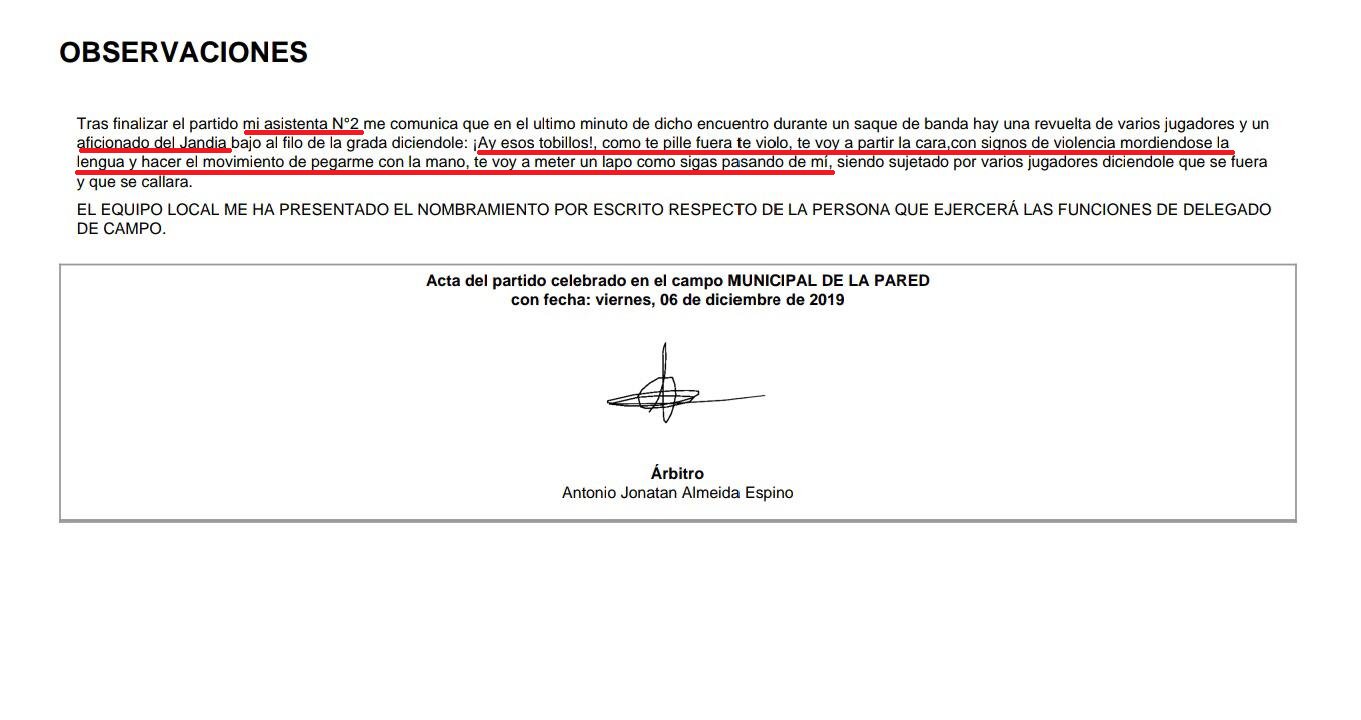 Los hechos se recogen en el acta arbitral del encuentro entre el Chilegua y el Jandía celebrado el pasado viernes, al que ha tenido acceso MARCA: "En el último minuto del encuentro se produce una revuelta entre varios jugadores y un aficionado del Jandía bajo el filo de la grada diciendo a mi asistente número 2: ¡Ay esos tobillos! Como te pille fuera te violo, te voy a partir la cara. Haciendo signos de violencia, mordiéndose la lengua y hacer movimiento de pegarle con la mano. Teniendo que ser sujetado por varios jugadores".
