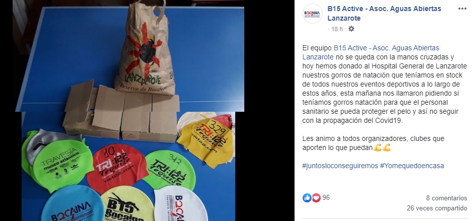Las redes sociales continúan acercándonos historias, en esta particular cuarentena, que responden a la humanidad y al espíritu más solidario del deporte. La Asociación de Natación Aguas Abiertas B-15 Active Lanzarote no se ha querido quedar atrás y ha realizado una particular donación.