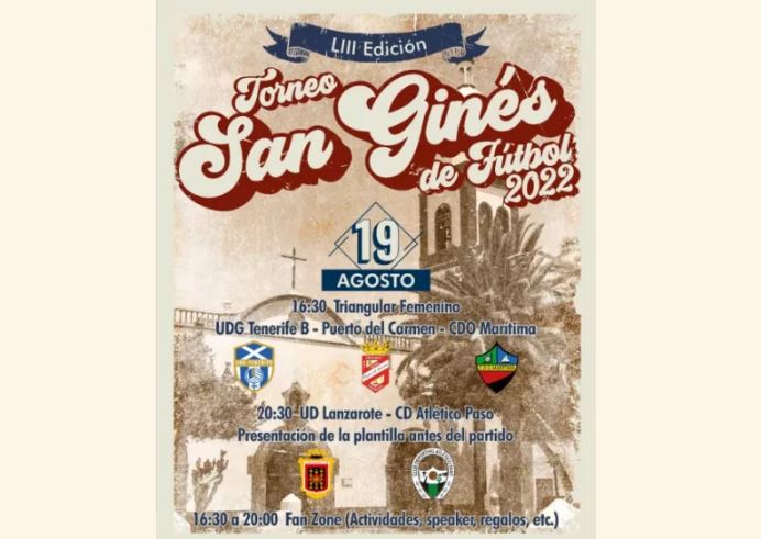 Y a las 20.30 horas comenzará la 53ª edición del Torneo de Fútbol San Ginés en su categoría masculina -decano de los torneos veraniegos que se disputan en Canarias- que enfrentará a la UD Lanzarote con el equipo palmero Atlético Paso, campeón del grupo canario de Tercera División la pasada temporada.