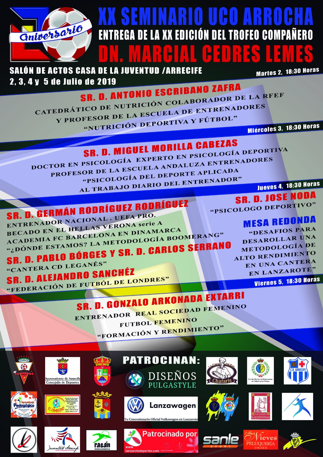 Los días 2, 3, 4 y 5 de julio se celebra la vigésima edición del Seminario Uco Arrocha, un enceuntro anual de los entrenadores de la isla de Lanzarote y que sirve para seguir formándose en diferentes materias relacionadas con el fútbol. En esta edición se tratarán temas relacionados con la nutrición, la psicología deportiva o el crecimiento que está experimentando el fútbol femenino en nuestro país. Las ponencias y las charlas se desarrollarán en las instalaciones de la Casa de la Juventud de Arrecife.