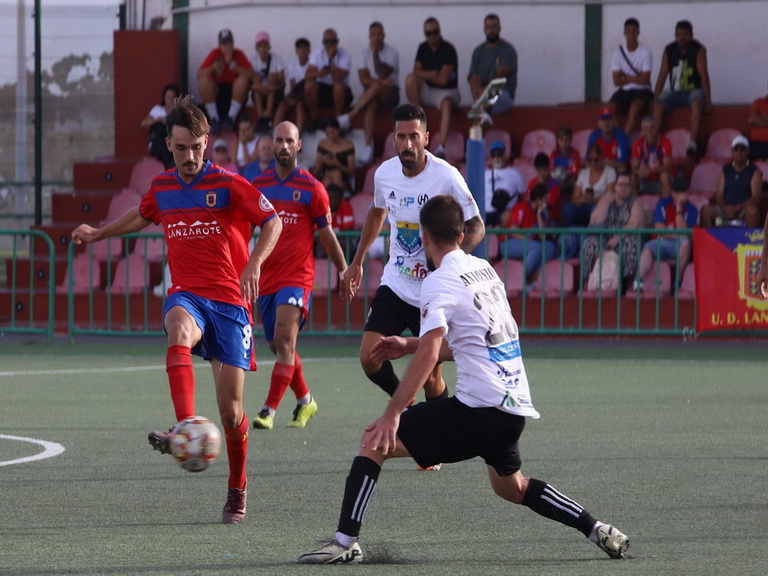 Salió la UD Lanzarote con la intensidad necesaria para dominar el choque en los primeros minutos, ejerciendo una fuerte presión al rival y teniendo bastante verticalidad en sus acciones de ataque. Un cabezazo de Iván Aguilar a centro de Ale Fuentes y un lanzamiento de falta de Oli que puso en problemas al portero local, fueron las ocasiones más claras de los rojillos en la primera mitad.