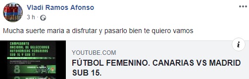 Son cinco concretamente futbolistas las que competirán en la categoría sub 15. La UD Lanzarote aporta a la selección a Sara Niz, Aimara y Ainhoa Delgado. María Yezaret Ramos, del Haría CF también estará en Madrid. (Vladi, jugador naranja transmitía ánimos a través de las redes sociales a su hija). También la ex jugadora del Puerto del Carmen, Jennifer López, se enfundará la elástica canaria.