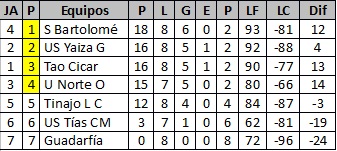 San Bartolomé Graficame con 18 puntos, Unión Sur Yaiza Graficame 16, Tao Cicar 16 y Unión Norte Orvecame 15, que libraba en esta jornada, son los equipos que de momento ocupan las 4 primeras posiciones que dan derecho a entrar en la lucha de semifinales por el título.