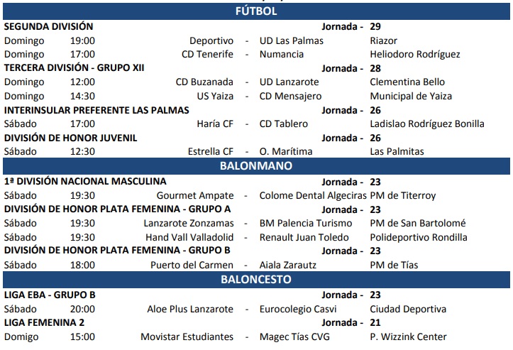 Este fin de semana se desarrollará una nueva jornada en el polideportivo de la isla de Lanzarote. En la imagen que podrán ver a continuación están recogidos todos los compromisos del ámbito futbolístico, del balonmano y del mundo de la canasta.