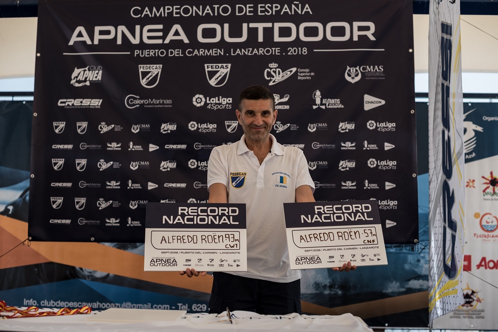 El tinerfeño Alfredo Roën realizó una gran actuación llevándose dos medallas de oro en las disciplinas de Peso Constante con aletas (CWT) y Peso Constante sin aletas (CNF). Estas dos marcas supusieron dos nuevos Récords Nacionales para el canario con -93 metros en la modalidad de CWT y de - 57 metros en CNF, récords que suma a los más de 20 récords nacionales y un récord del mundo que tiene en su currículo.
