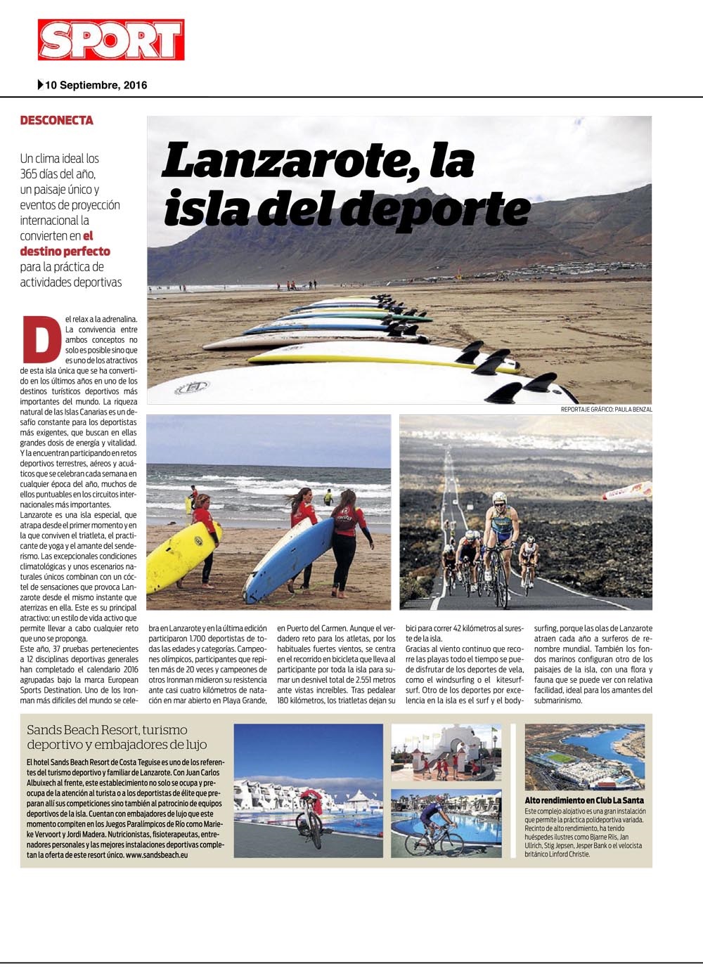 • “Del relax a la adrenalina. La convivencia entre ambos conceptos no solo es posible sino que es uno de los atractivos de esta isla única que se ha convertido en los últimos años en uno de los destinos turísticos deportivos más importantes del mundo”. Con estas líneas comienza el reportaje titulado 'Lanzarote, la isla del deporte', publicado el pasado 10 de septiembre en el suplemento del prestigioso diario deportivo 'Sport', denominado ‘Sport & Style’, que elabora la destacada periodista deportiva Carme Barceló.