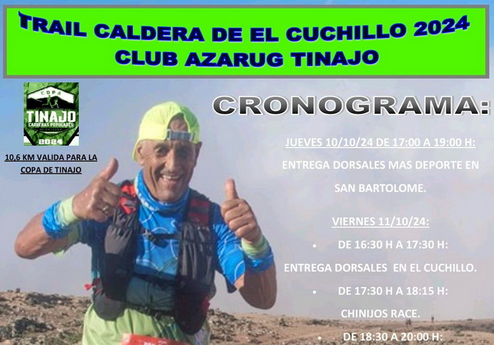 La prueba deportiva de El Cuchillo, organizada por el Club Azarug Tinajo, cuenta con la colaboración del consistorio tinajero, de Deportes Tinajo, de Lanzarote Deportes y Más Deportes y consistirá en las habituales pruebas, arrancando con la carrera para los más pequeños, la Chinijos Race, la prueba de 5.1 kilómetros y la prueba grande de 10.6 kilómetros, valedera para la Copa de Carreras Populares de Tinajo. Inscripciones para las distintas pruebas en la página web www.cronolinecanarias.com.