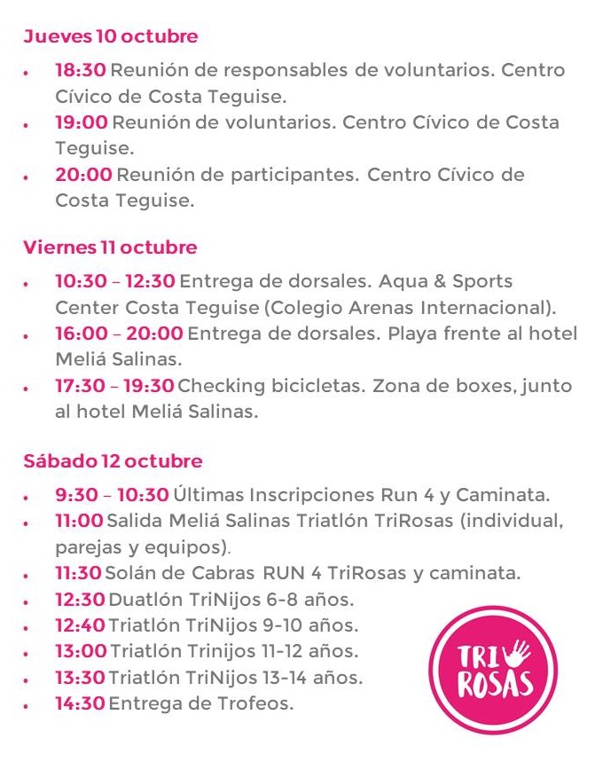 El próximo sábado llegará a la isla de Lanzarote una prueba importante por lo que representa. El Triatlón TirRosas estará acompañado este 2019 por una carrera de 4 km -Run 4 Solán de Cabras- que servirá para abrir el abanico y, de esta manera, ofrecer una prueba accesible para un mayor número de deportistas que quiera aportar su granito de arena a la causa... (LEER MÁS)