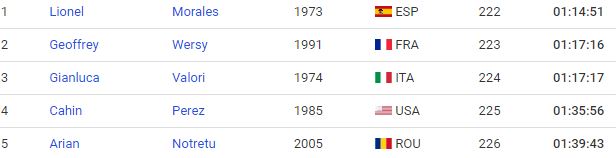 Lionel Morales venció con un tiempo de 1:14:51, en segundo lugar lo ocupó el francés Geoffrey Wersy (1:17:16) y el tercer lugar fue para el italiano Gianluca Valori (1:17:17).