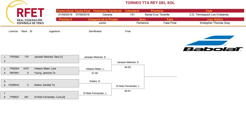 Luna Di Noto sigue creciendo a pasos agigantados. La tenista conejera donde va deja huella y es que este fin de semana se ha vuelto a subir a lo más alto del cajón en el Torneo TTA Rey del Sol después de sortear una complicada final ante la inglesa Janssen Medved, S.