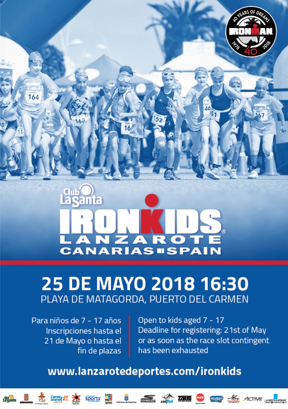 El Ironkids Lanzarote, que se celebra a partir de las 16.30 horas de mañana viernes 25 de mayo en Puerto del Carmen -concretamente a la altura de la playa de Matagorda, en la confluencia de la Avenida de las Playas con la calle Agonal- cuenta con más de 250 inscritos distribuidos entre las cinco categorías que entran en competición: Prebenjamín (38 inscritos), Benjamín (68), Alevín (60), Infantil (49) y Cadete (38).