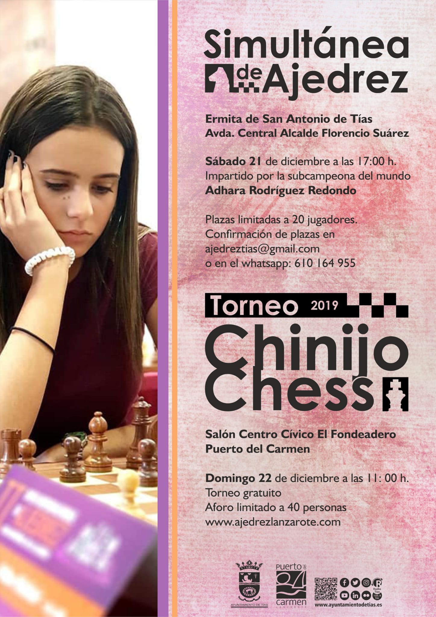 El próximo sábado a partir de las 21:00 la subcampeona del mundo sub-16 Adhara Rodríguez, jugará contra 20 jugadores de forma simultánea en la Ermita San Antonio de Tías.