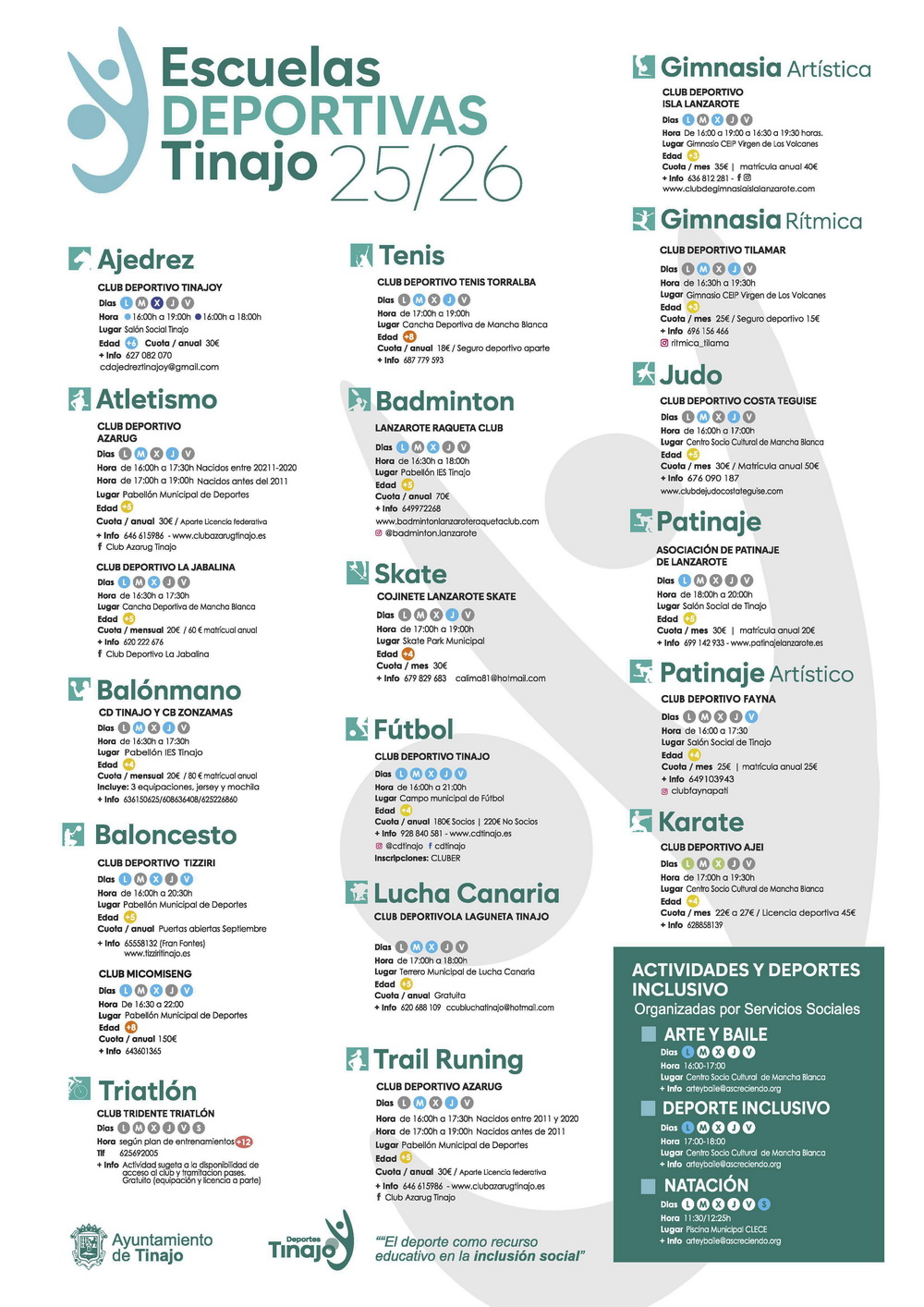Además, se suman tres modalidades inclusivas: arte y baile, deporte inclusivo y natación. Estas actividades se desarrollan gracias al acuerdo de colaboración entre las escuelas y clubes de Tinajo, las concejalías de Deportes y Servicios Sociales y la asociación Creciendo Yaiza.