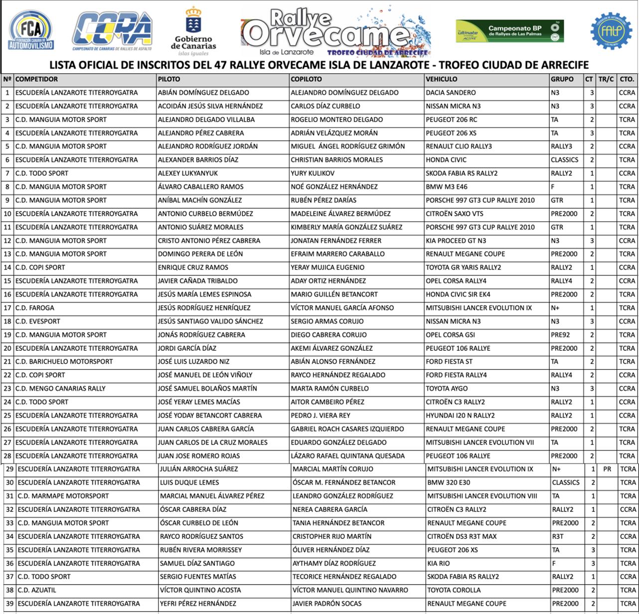 Un total de 39 equipos forman la lista de inscritos de la próxima edición del Rallye Orvecame Isla de Lanzarote-Trofeo Ciudad de Arrecife, que se disputa este viernes y sábado como primera cita del CCRA y del Campeonato bp de Las Palmas 2026, además de segunda prueba del Campeonato Insular de la isla de los volcanes. Muchos favoritos y vehículos tipo Rally2 que animarán mucho el desarrollo de la prueba.