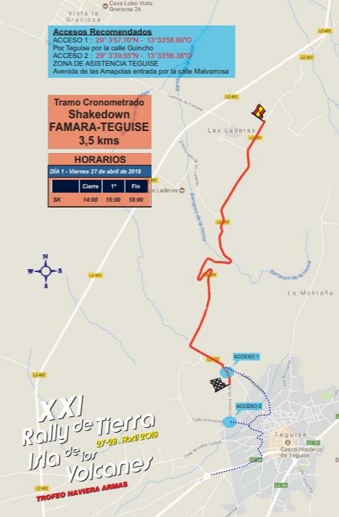 La hora de la verdad comenzará un poco antes este mismo viernes con el Shakedown o tramo de entrenamiento y el Tramo de Calificación, obligatorio para todos los pilotos prioritarios, a partir de las 15:00 horas de la tarde. Para estas dos actividades pre-rallye se utilizará la prueba especial Famara-Teguise de 3,5 kms., localizada muy cerca del casco de la Villa de Teguise.